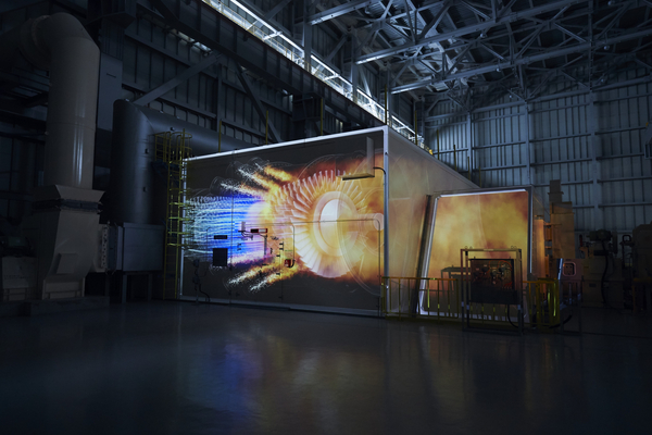 ガスタービンが収められている箱にプロジェクションマッピングの映像が映し出される。リアルな映像で迫力満点