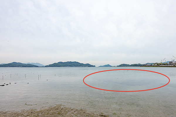 試験場となっている松永湾の干潟。赤く囲まれている付近にHiビーズが散布されている